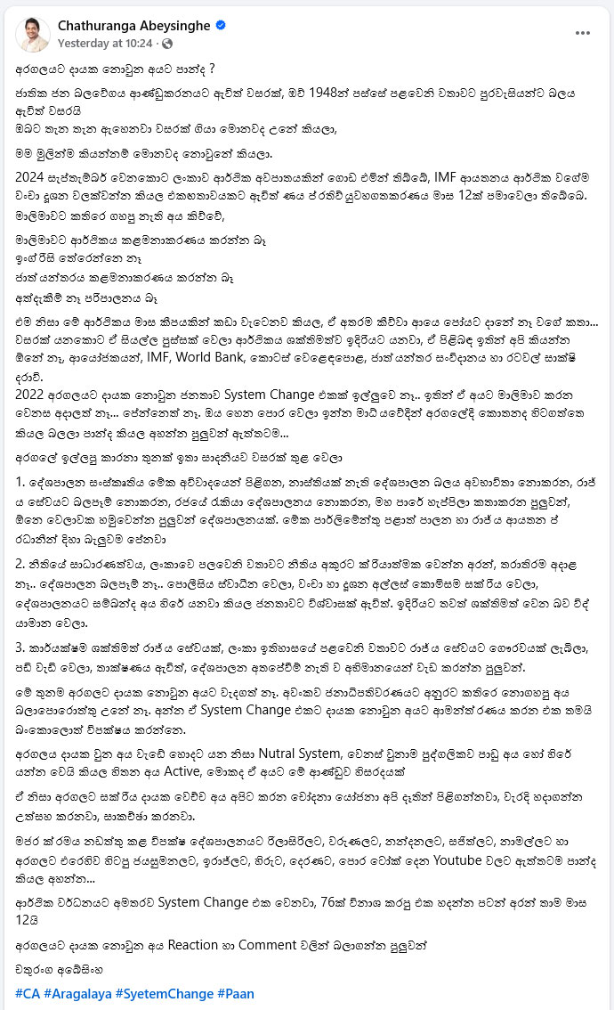 In a Facebook post on October 6, 2025, Abeysinghe questioned critics of the NPP administration, particularly those who did not participate in the Aragalaya, the series of protests that began in March 2022 demanding political and economic reform.