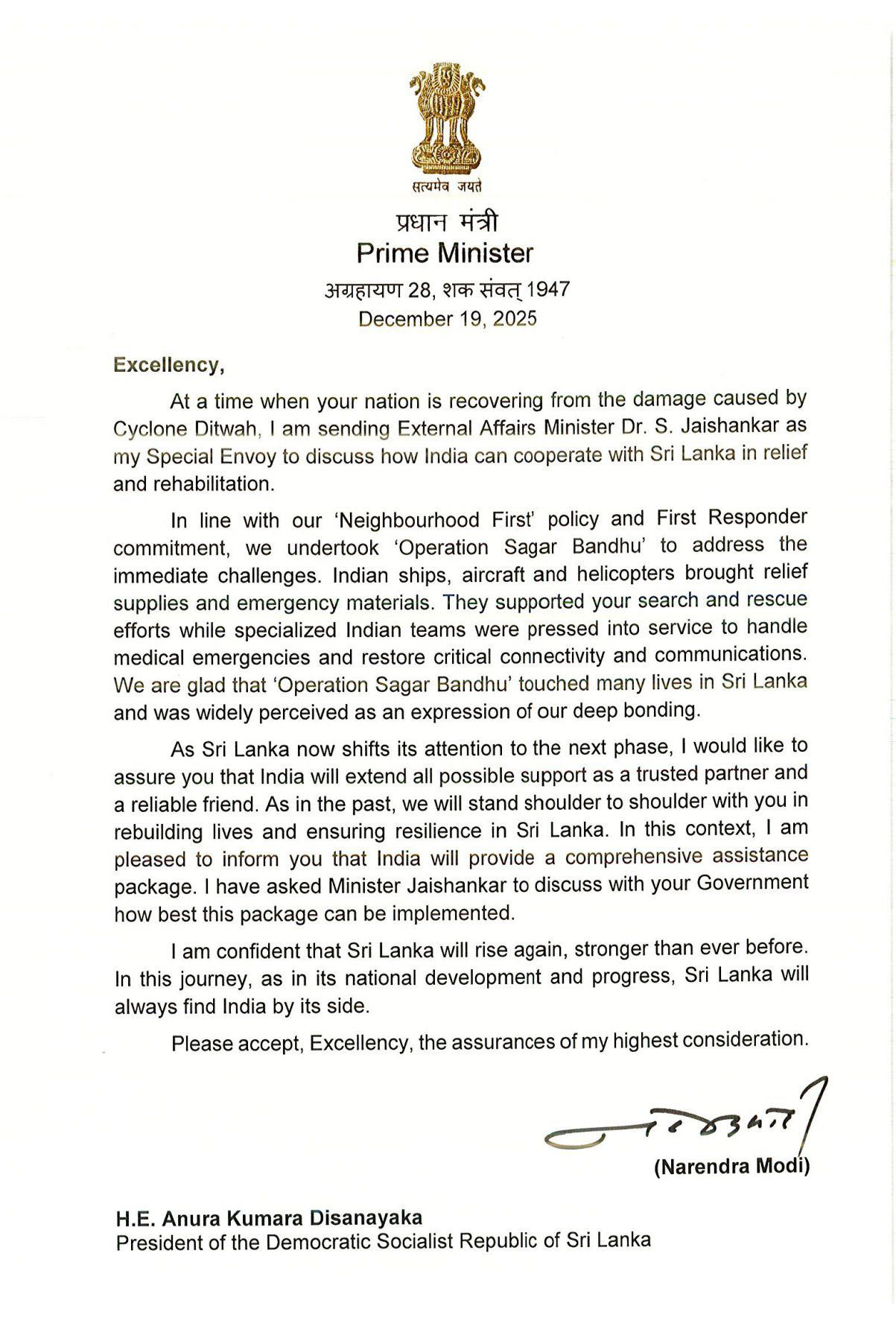 At a time when your nation is recovering from the damage caused by Cyclone Ditwah, I am sending External Affairs Minister Dr. S. Jaishankar as my Special Envoy to discuss how India can cooperate with Sri Lanka in relief and rehabilitation.